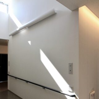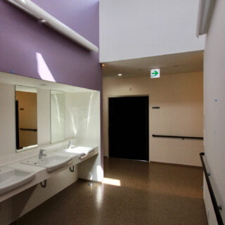木造平屋建てであることから、平面が広がった横運動の多い施設となるため、内部動線の計画は極力シンプルに、凹凸をなくし、広い平面でありながらも移動がスムーズに行えるように配慮しました。また、明るいイメージを先行させ白一色とするのではなく、要所に様々な”色”を散りばめ、「私の部屋は○○色のとなり…」「食堂は○○色のむこう…」など、その色が認識機能の補助として働くように計画をしています。こうした視覚情報のみではなく、触覚にも訴えることができるよう”ざらついた”壁や”つるっとした”建具などを要所に採用し、全体として、明るく清潔なイメージを崩さないよう気をつけながら、バラバラな視覚や触覚の情報を統制しました。